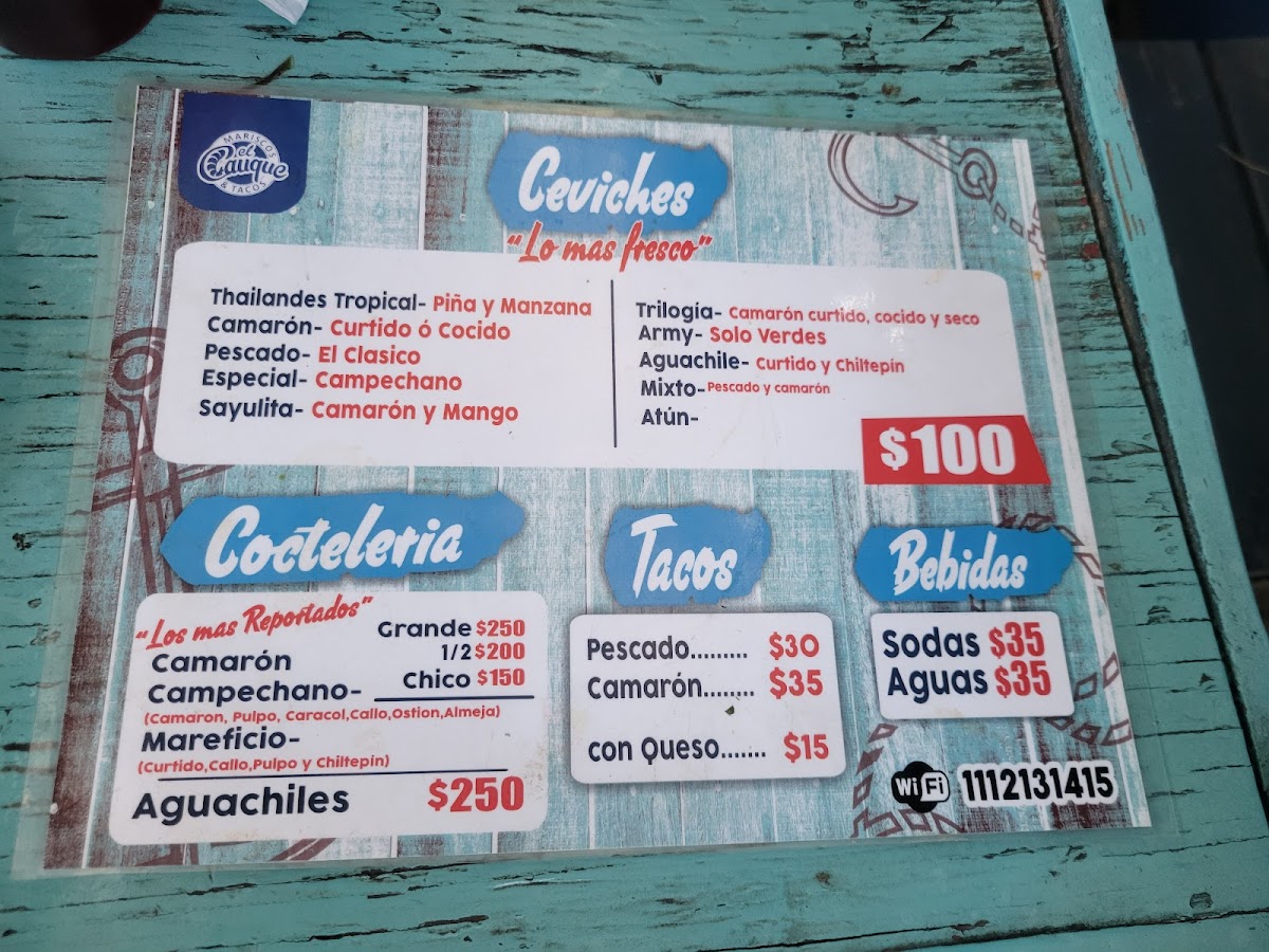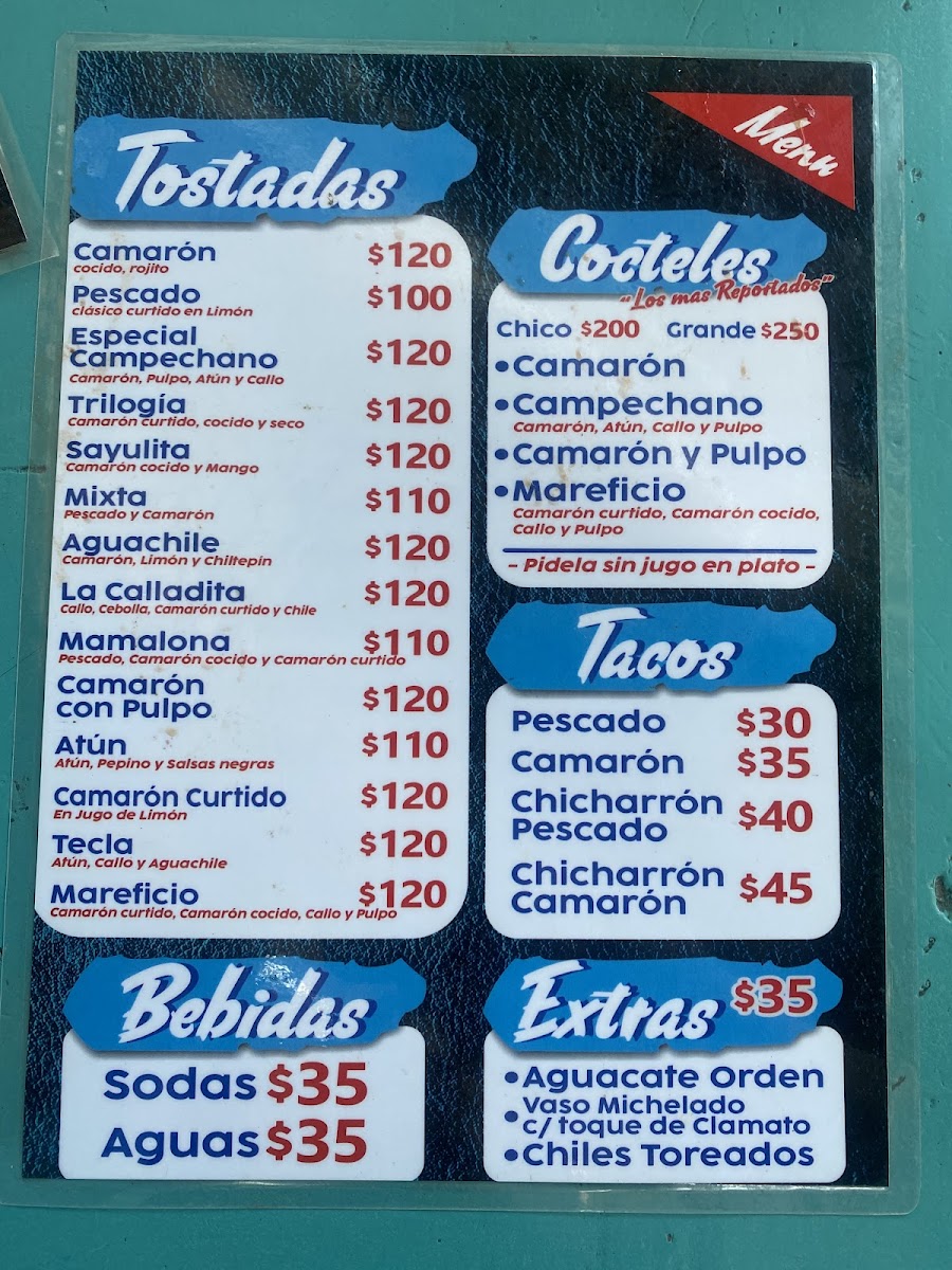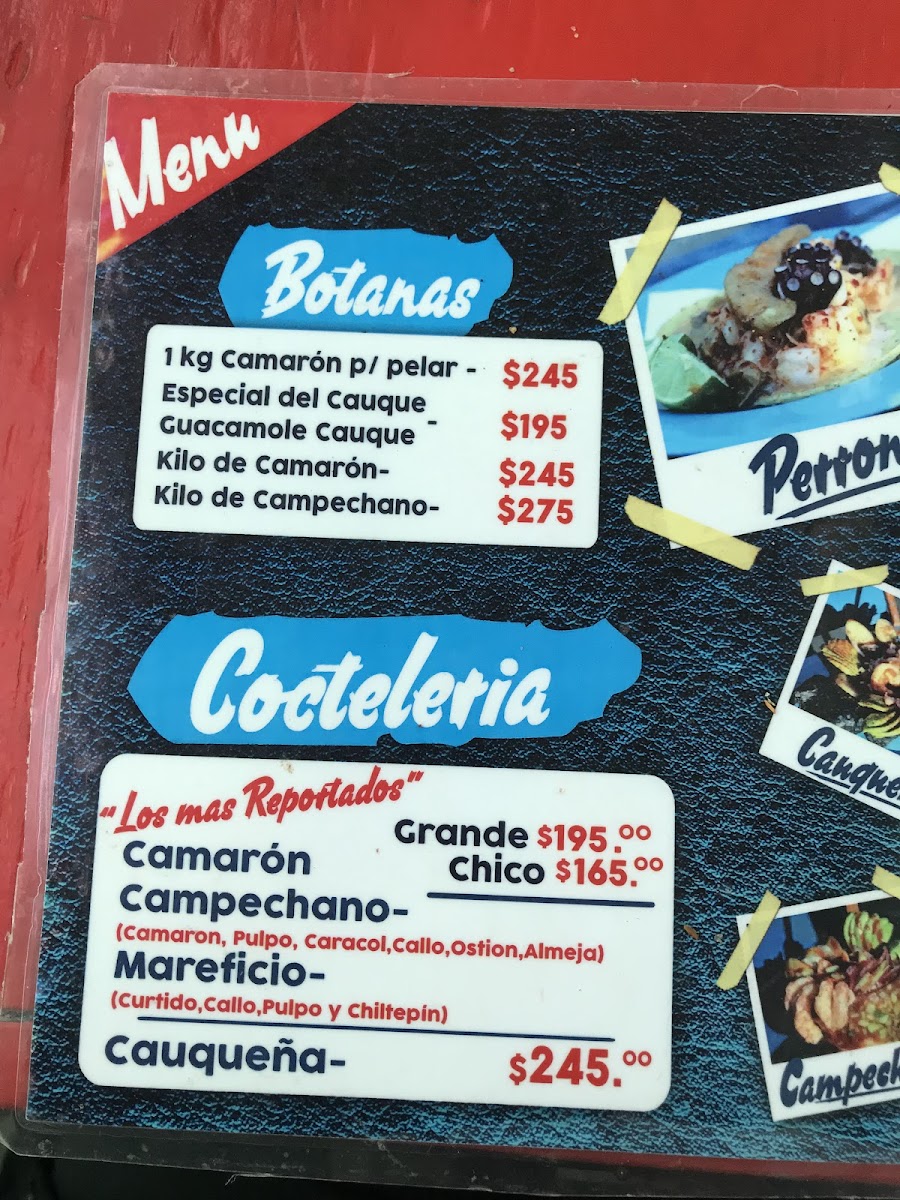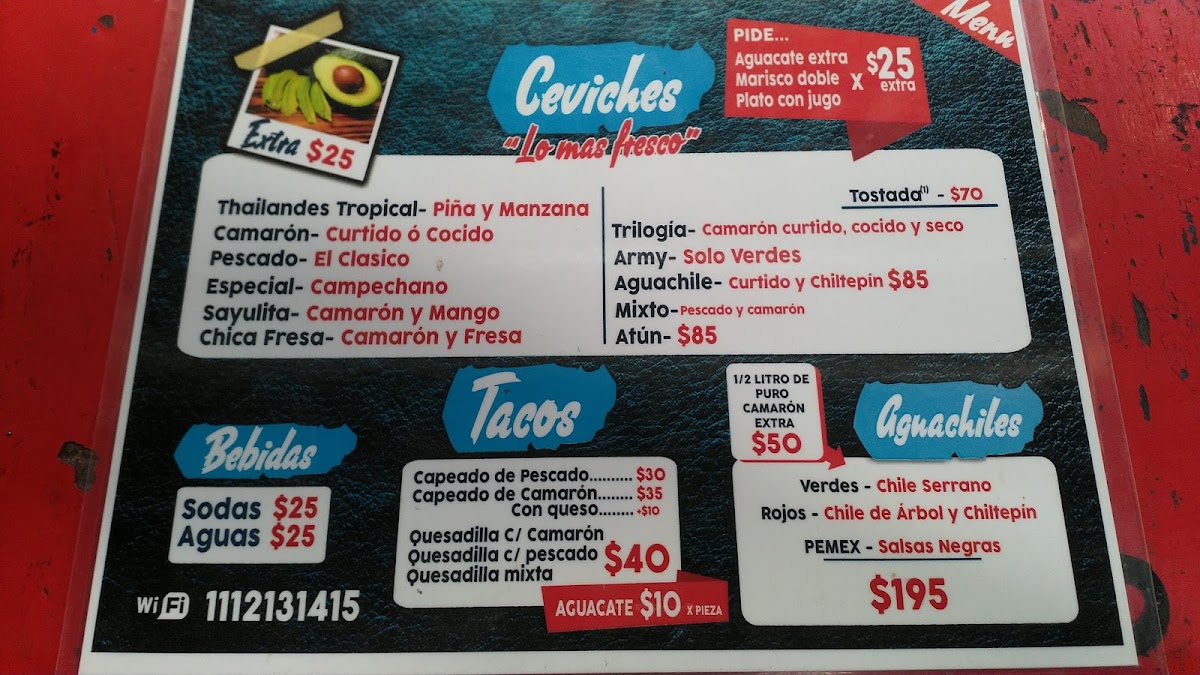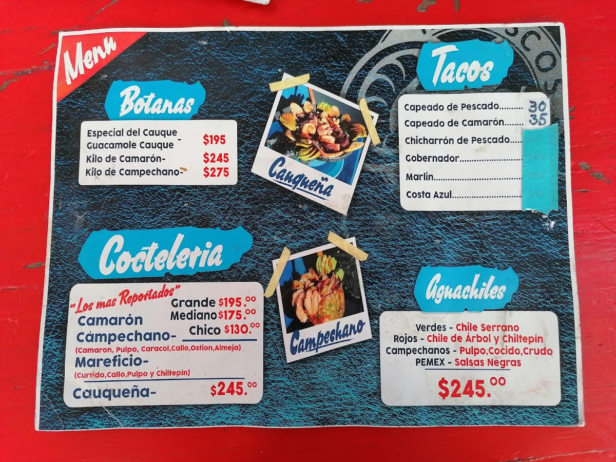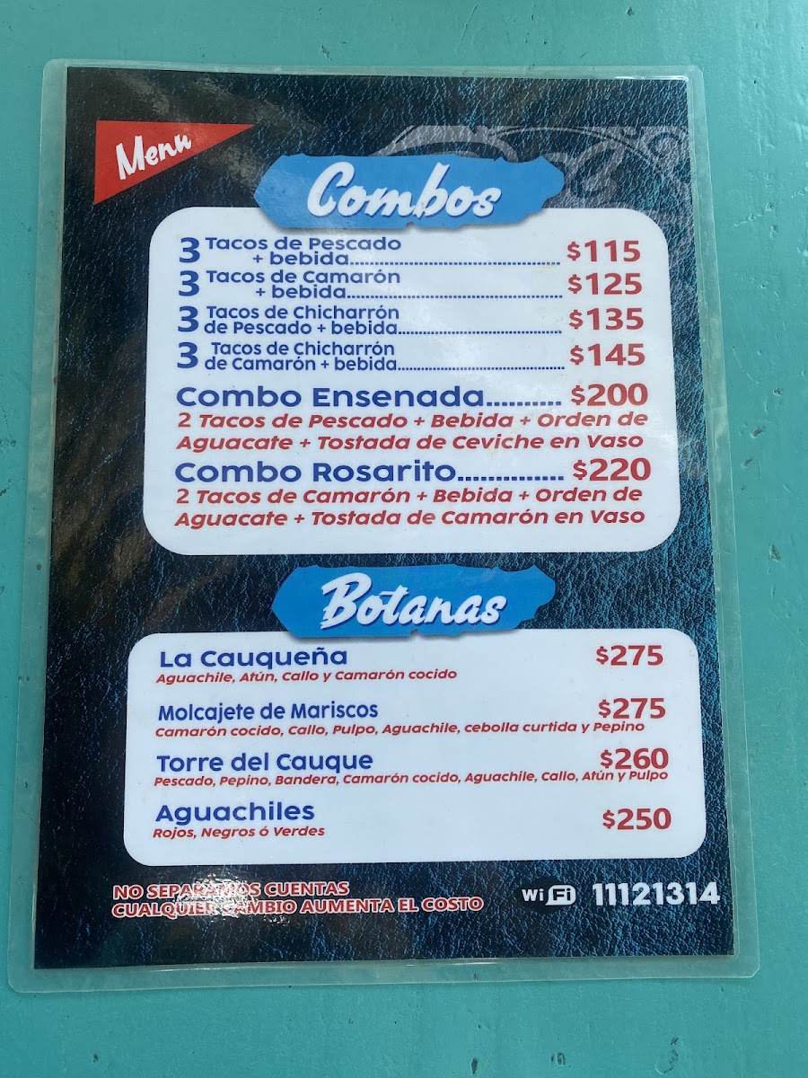 From a reviewer’s perspective, the menu at Mariscos El Cauque keeps things simple and focused, highlighting a few staple items that showcase the restaurant’s seafood specialties. The refreshing Agua Del Dia is a great complement to the meal, especially when paired with the combo options. The combos are clearly centered around tacos, with options like 5 Tacos De Pescado, 3 Tacos De Pescado Agua Fresca, 3 Tacos De Camarón Agua Fresca, 5 Tacos De Camarón, and 10 Tacos De Camarón, giving diners flexibility depending on appetite and preference between fish and shrimp. Overall, the menu may be concise, but it emphasizes classic mariscos flavors and practical combo meals, making it easy for customers to choose a satisfying seafood taco experience with a refreshing drink on the side.